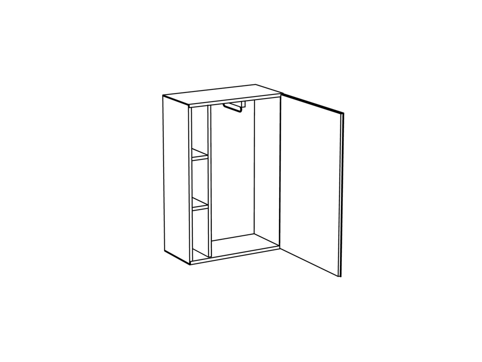 Шкаф с двумя отделениями за одной распашной дверью: в левом отделении - щитовые полки, в правом - выдвижная штанга. Дверь открывается по принципу «нажал-открыл». Шкаф крепится к стене.