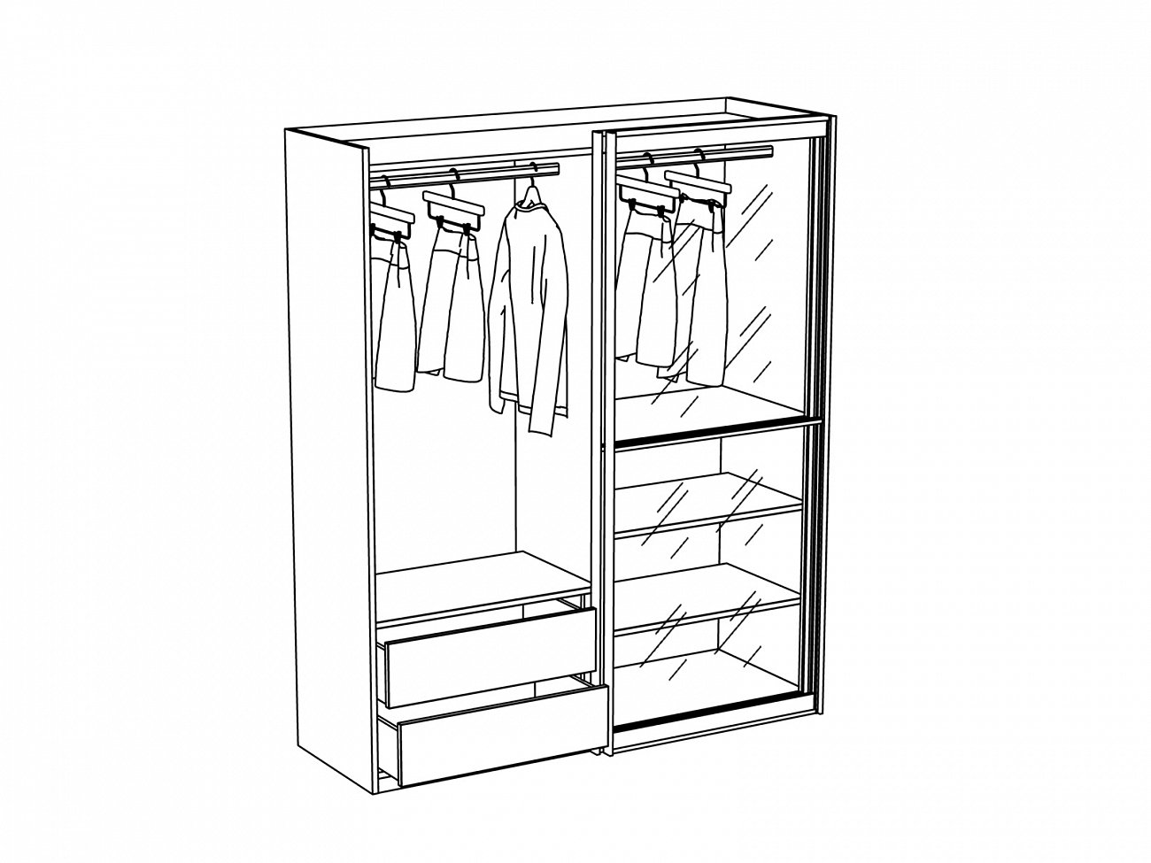 Шкаф-купе со стеклянными дверями и двумя отделениями. В правом отделении: сверху расположена штанга для одежды, в нижней части идут в комплекте штанга для одежды и две съёмные полки. В левом отделении: в верхней части – штанга для одежды, в нижней - комод.